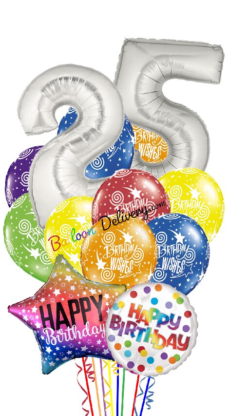 An excellent mix of latex and mylar balloons including two custom Giant Age Mylar balloons and printed latex birthday wishes.